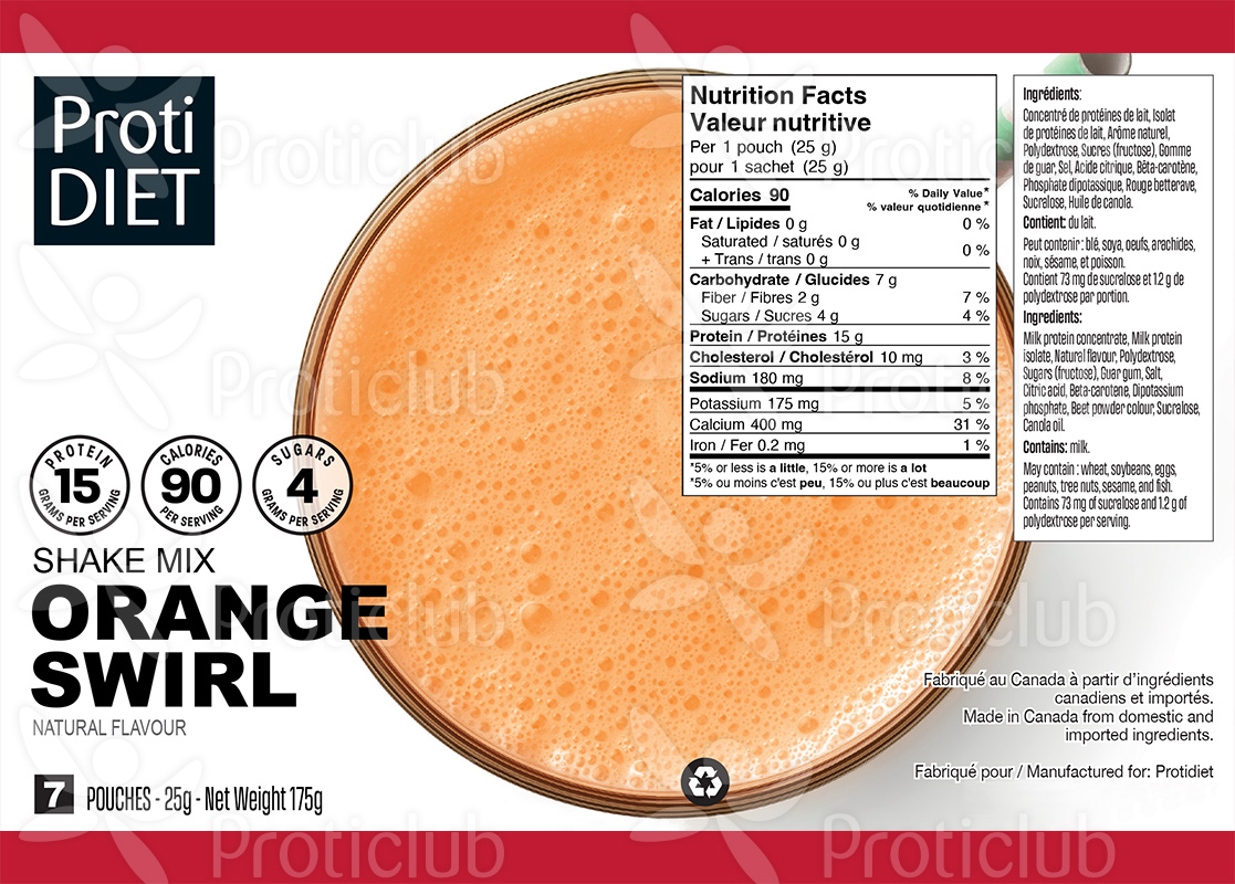 INGREDIENTS : Protein blend (milk protein concentrate, milk protein isolate), natural flavour, polydextrose (1.2 g per serving), fructose, guar gum, salt, citric acid, beta-carotene, dipotassium phosphate, beet powder colour, sucralose (73 mg per serving), canola oil.