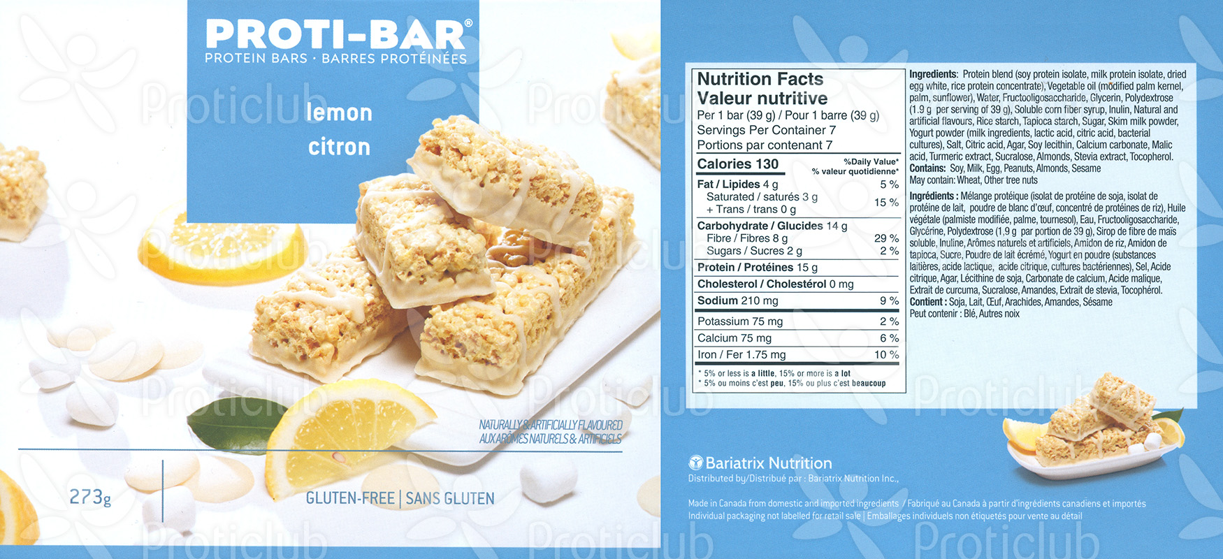 INGRÉDIENTS : Mélange protéique (isolat de protéine de soja, isolat de protéine de lait, poudre de blanc d’œuf, concentré de protéine de riz), huile végétale (de palmiste modifiée, de palme, de tournesol), eau, fructooligosaccharide, glycérine, polydextrose (1.9 g par portion), sirop de fibre de maïs soluble, inuline, arômes naturels et artificiels, amidon de riz, amidon de tapioca, sucre, poudre de lait écrémé, yogurt en poudre (substances laitières, acide lactique, acide citrique, cultures bactériennes), sel, acide citrique, agar, lécithine de soja, carbonate de calcium, acide malique, extrait de curcuma, sucralose, amandes, extrait de stevia, tocophérol.