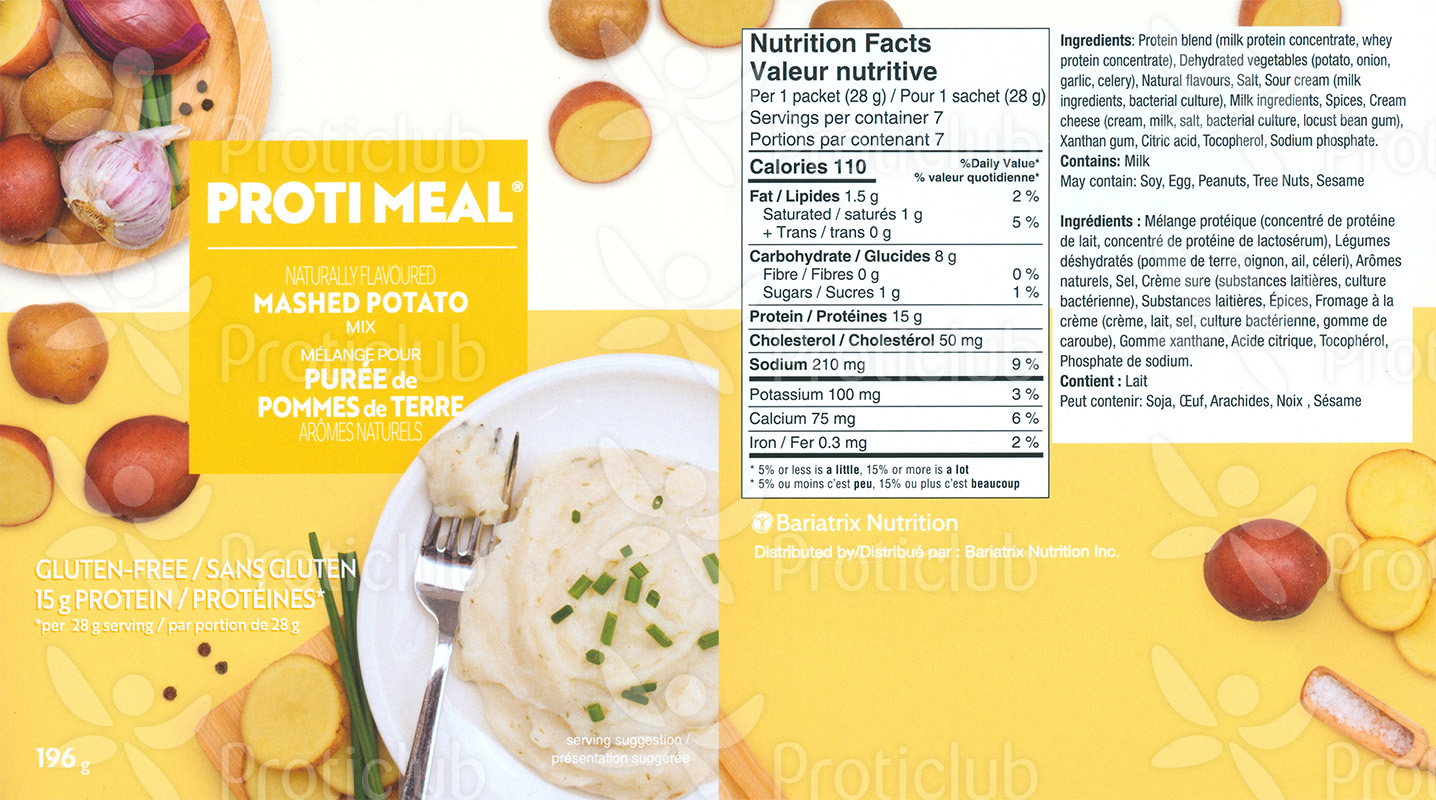 INGRÉDIENTS : Mélange protéique (concentré de protéine de lait, concentré de protéine de lactosérum), légumes déshydratés (pomme de terre, oignon, ail, céleri), arômes naturels, sel, crème sûre (substances laitières, culture bactérienne), substances laitières, épices, fromage à la crème (crème, lait, sel, culture bactérienne. gomme de caroube), gomme xanthane, acide citrique, tocophérol, phosphate de sodium.